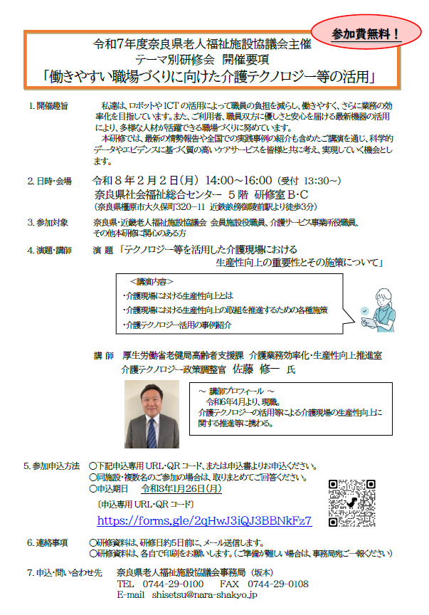 奈良県老人福祉施設協議会より、標記研修会の案内をいただきました。 以下の通りご案内いたします。 本研修では、最新の情勢報告や全国での実践事例の紹介も含めたご講演を通じ、科学的データやエビデンスに基づく質の高いケアサービスを皆様と共に考え、実現していく機会とします。 お申込みは、申込専用URL・QRコード、または参加申込書よりお申込みください。 参加申込書はこちら